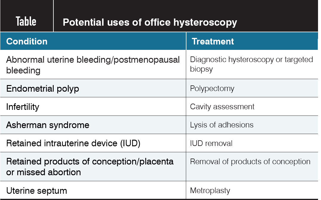 Improvements in hysteroscopes, optics, distension media, anesthetics, and hysteroscopic instruments have made office hysteroscopy (OH) more feasible and less painful for patients. 2 Advantages to OH include avoidance of general anesthesia, patient and physician convenience, faster recovery, and cost-effectiveness. 3