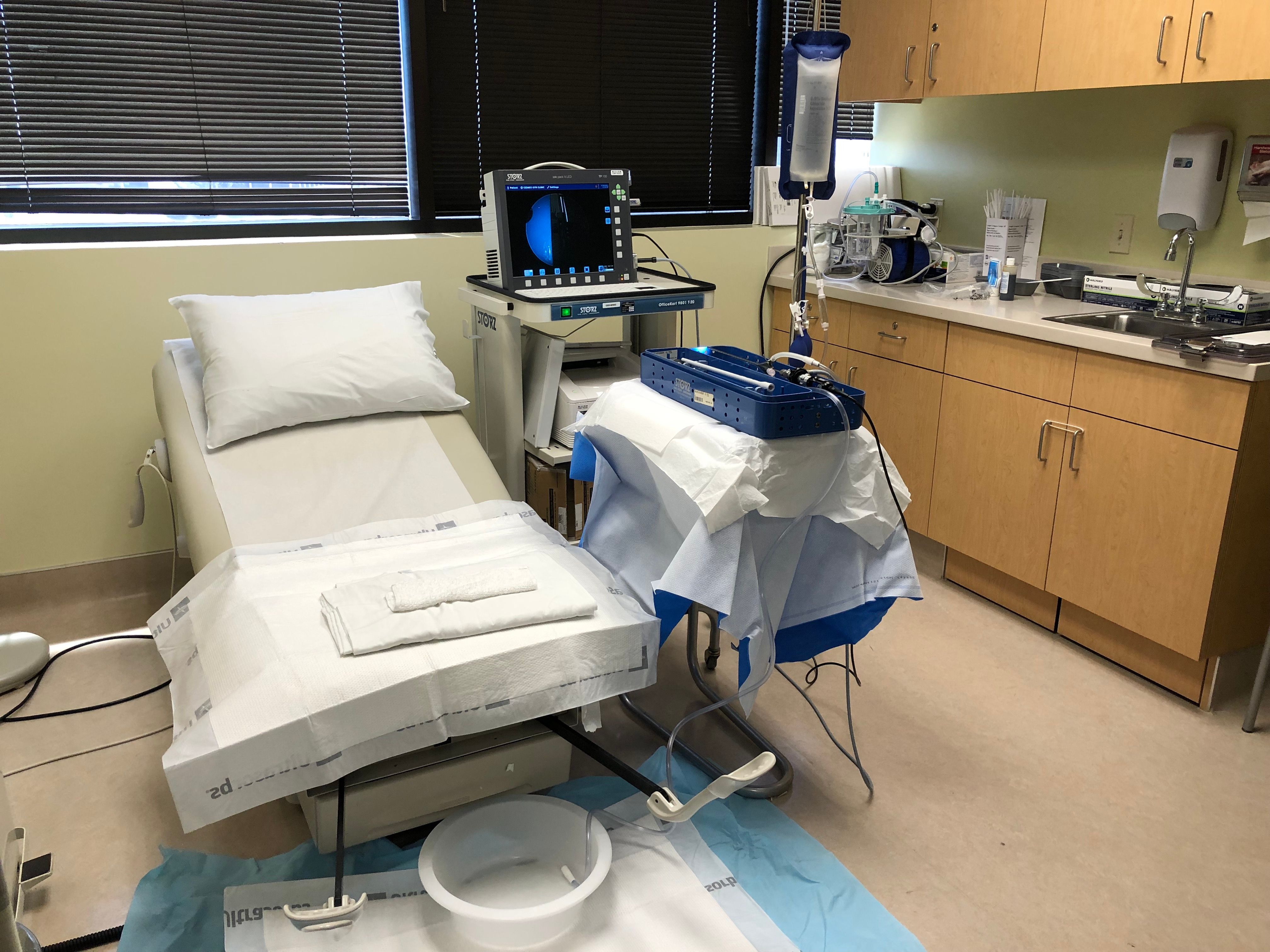 Hysteroscopy can be done in a small area like a converted exam room (Figure 1). An exam table that rises and lowers is preferred. In addition to the hysteroscope, a visualization system is required, such as a camera, light source, and monitor, as well as the ability to capture images for the electronic health record (Figure 2).